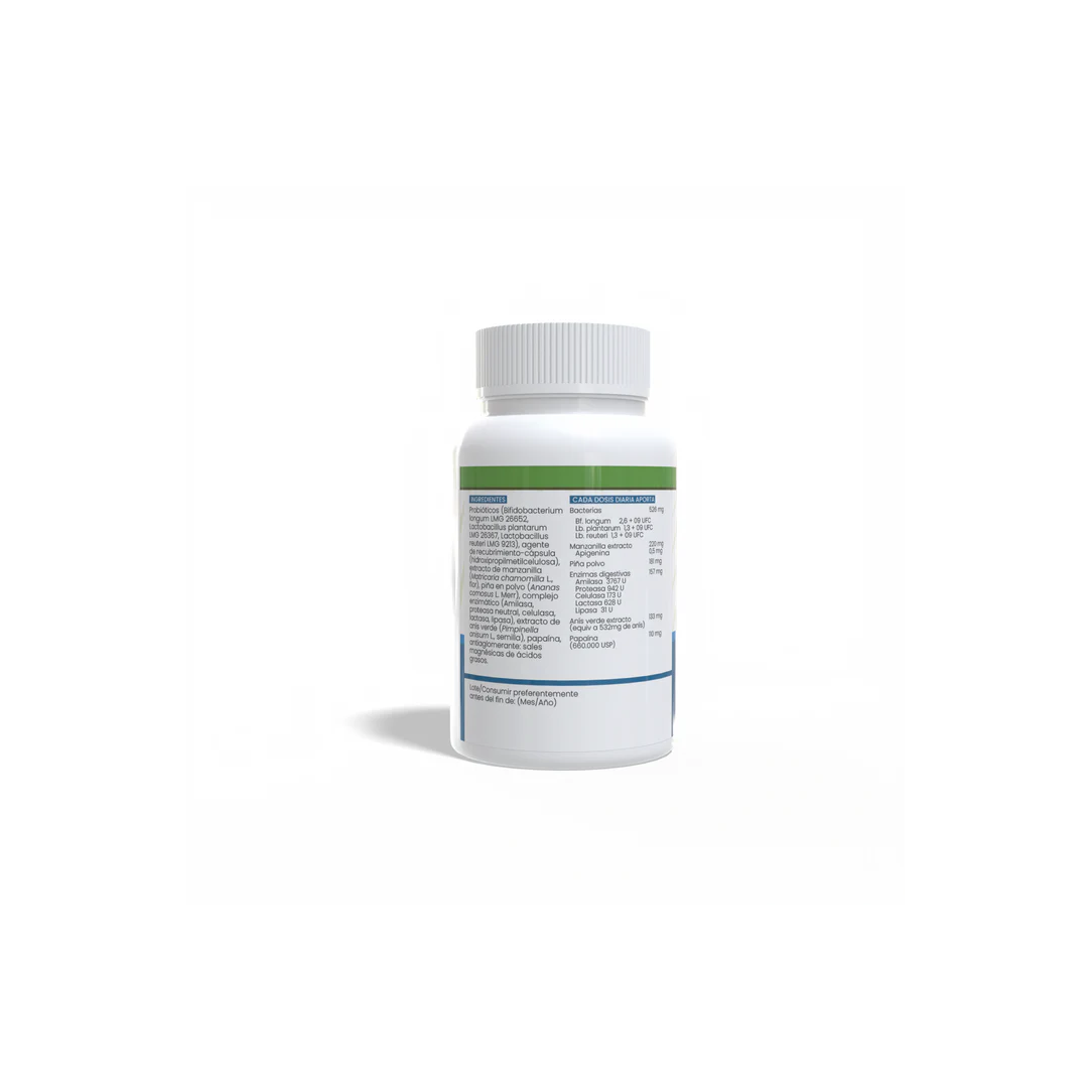 Por dosis diaria: bacterias 526 mg (2.64x10⁹ UFC), manzanilla 270 mg, papaya 133 mg, enzimas digestivas (amilasa 110 mg, proteasa 220 mg, lipasa 15 mg, lactasa 57 mg, celulasa 100 mg, papaína 110 mg).