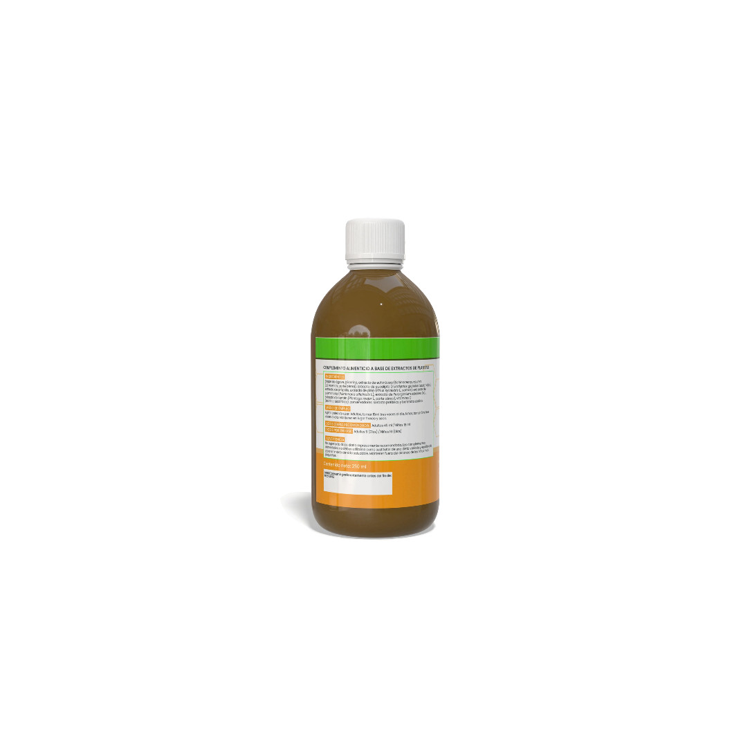 Contiene fructosa (200ml) y extractos líquidos de propóleo (12,5ml), eucalipto (12,5ml), pino (12,5ml) y equinacea (12,5ml).