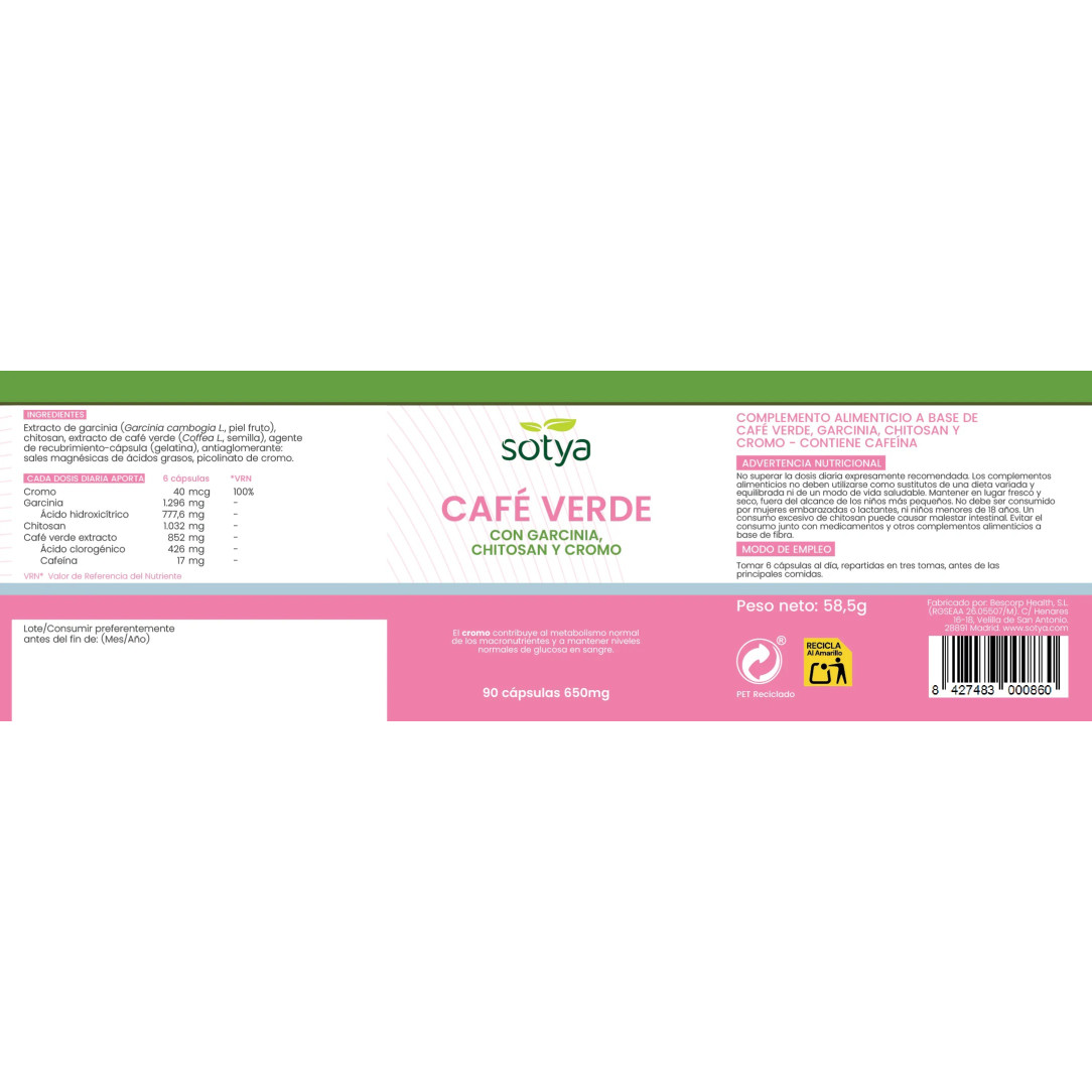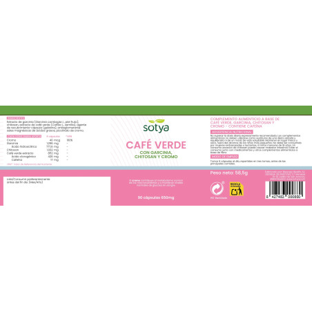 En envases de 90 cápsulas vegetales de 650mg. Cada cápsula contiene 214mg de extracto de Garcinia cambogia (60% ácido hidroxicítrico), 170mg chitosan, 145mg café verde extracto (45% ácido clorogénico), 6.7mcg picolinato de cromo. Cápsula vegetal de celulosa.