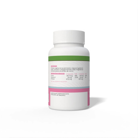 335mg de chitosan y 7mg de vitamina C (11,6% CDR), fructooligosacáridos y celulosa microcristalina. Cápsula de gelatina (100mg).Presentación
