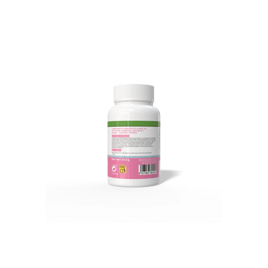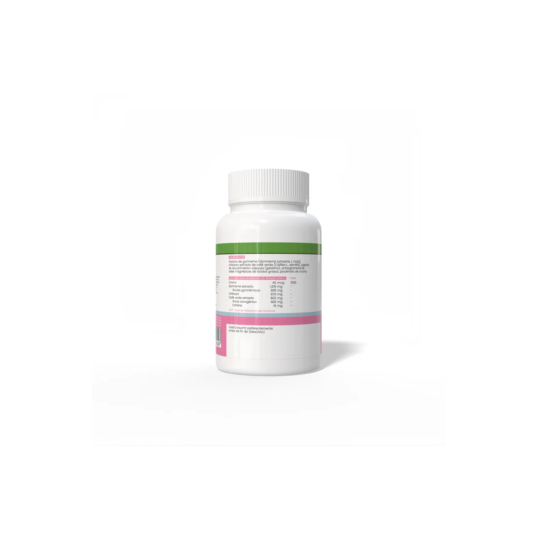 Complemento alimenticio que combina café verde, gymnema, chitosan y cromo. El cromo contribuye al metabolismo normal de macronutrientes y ayuda a mantener niveles normales de glucosa en sangre.