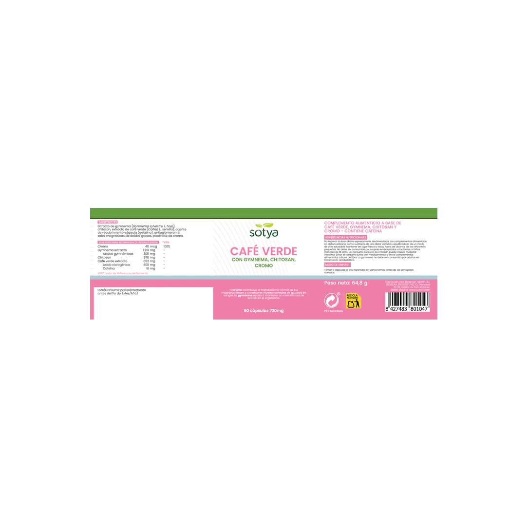 Café verde, gymnema, chitosan y cromo. Contiene cafeína.