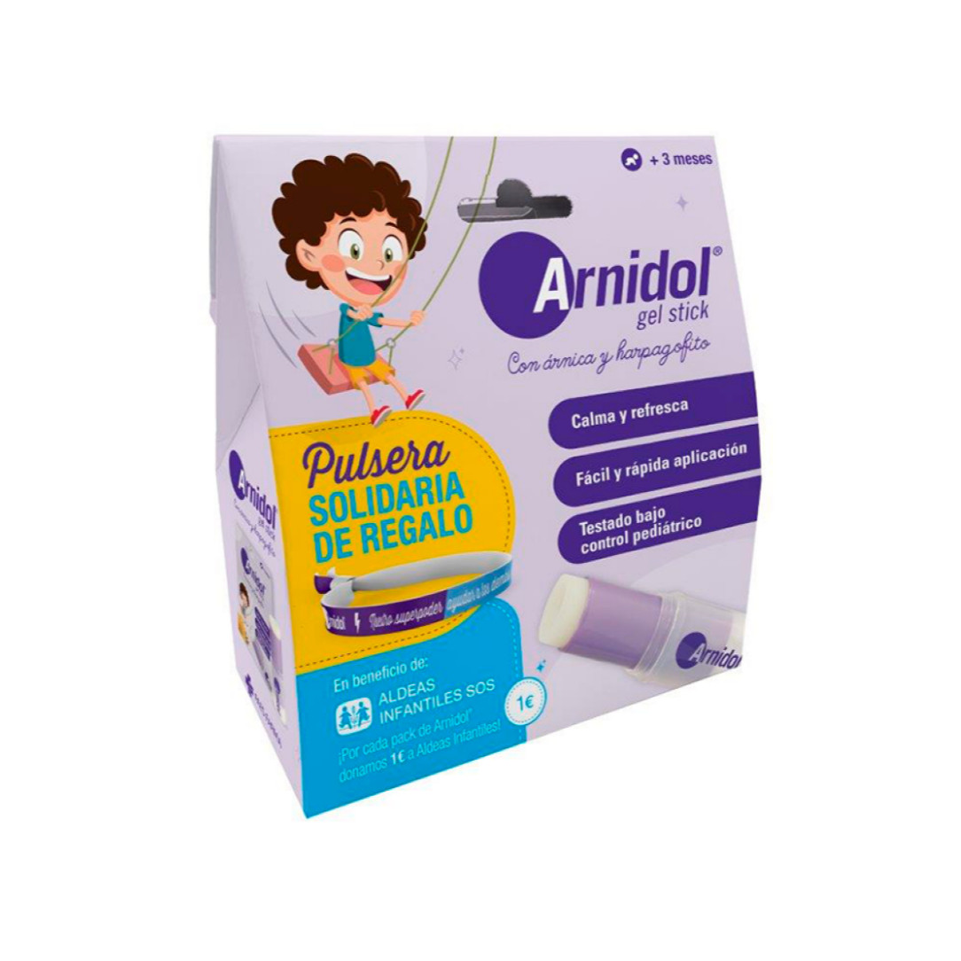 Arnidol® Stick Original es un práctico gel en barra formulado con ingredientes de origen natural como árnica y harpagofito, ideal para calmar, refrescar y reconfortar la piel tras pequeños golpes. Su aplicación es rápida y sencilla, perfecta para usar en cualquier momento y lugar. Además, este pack incluye una divertida pulsera de regalo para que los más pequeños se sientan acompañados mientras se alivian.