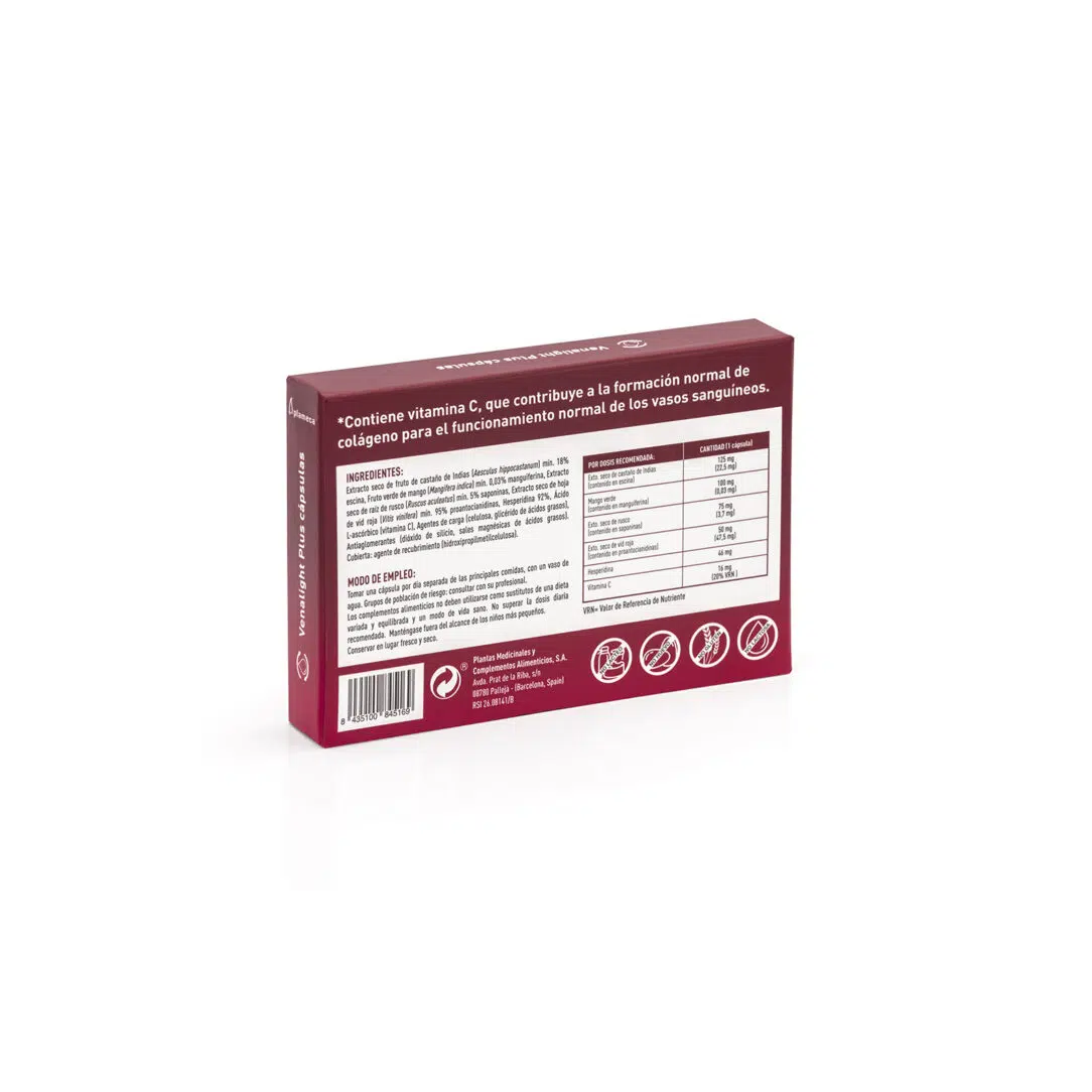 Venalight Plus de Plameca es un complemento alimenticio formulado para apoyar el bienestar del sistema venoso. Contiene extractos de plantas como vid roja, castaño de Indias, rusco y mango verde, junto a hesperidina y vitamina C, que contribuye a la formación normal de colágeno y al mantenimiento de unos vasos sanguíneos en condiciones normales.