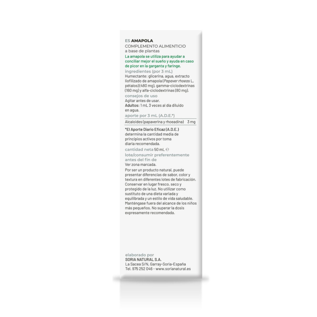 Soria NaturalExtracto de pétalos de amapola tradicionalmente utilizada para ayudar a conciliar el sueño. Fórmula con ciclodextrinas para mejor absorción. Sin alcohol.