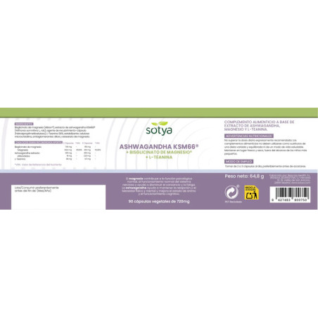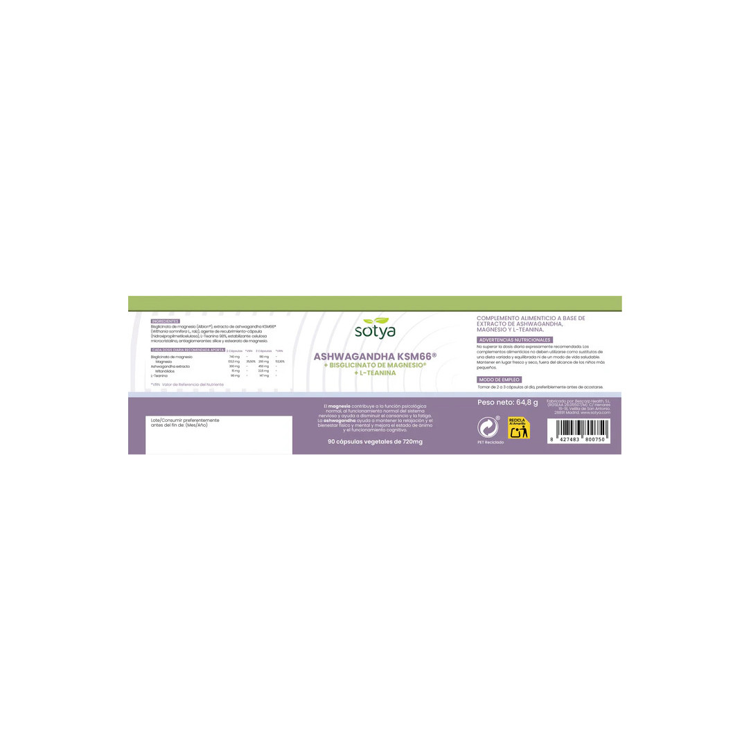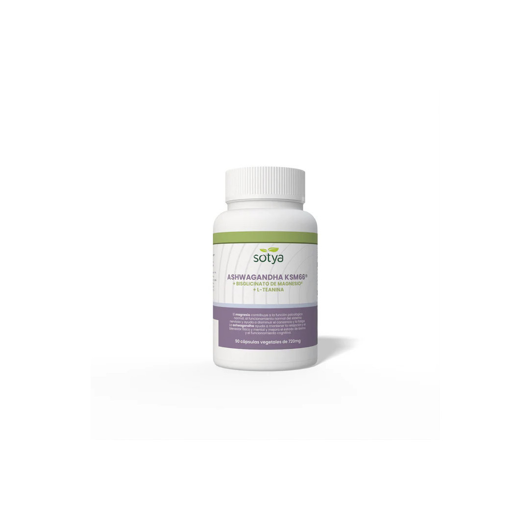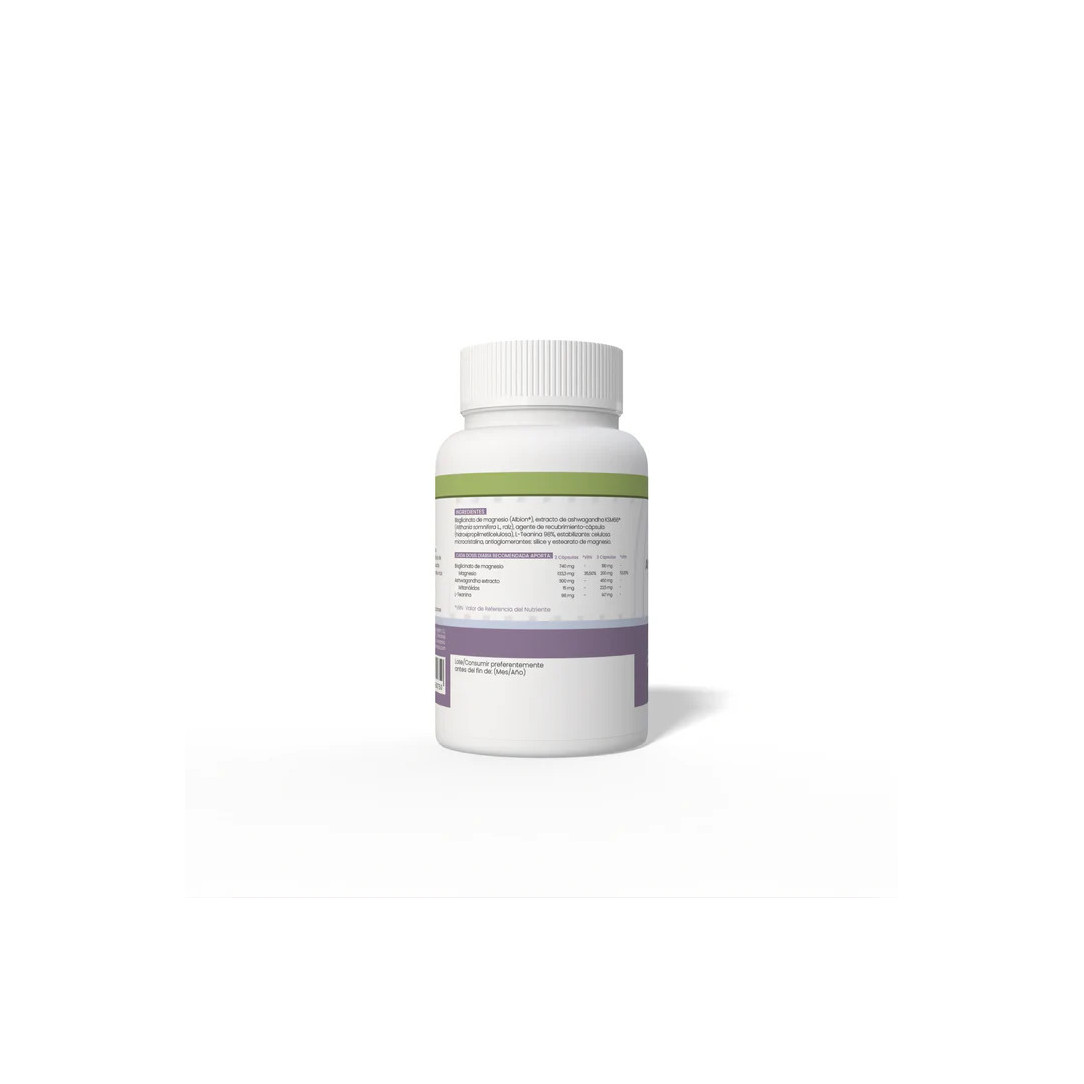 Complemento alimenticio que combina bisglicinato de magnesio, extracto de ashwagandha KSM66 y L-teanina en cápsulas vegetales. Su formulación reúne minerales y extractos vegetales utilizados habitualmente en este tipo de productos, en un formato práctico que facilita su integración en la rutina diaria.