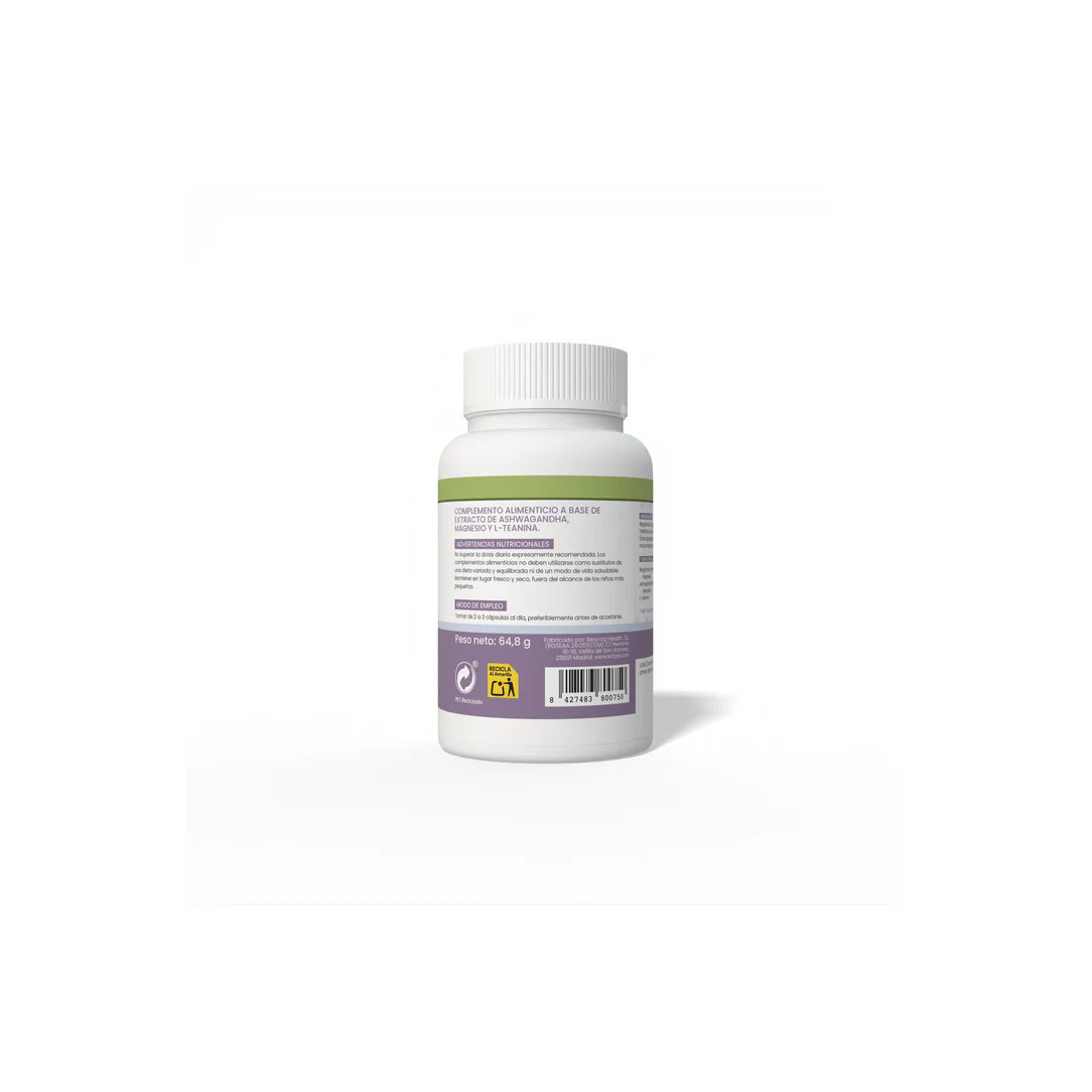 Complemento alimenticio en cápsulas vegetales que combina bisglicinato de magnesio, extracto de ashwagandha KSM66 y L-teanina. Una fórmula pensada para complementar la dieta diaria con una pauta de uso sencilla, recomendada preferentemente antes de acostarse.