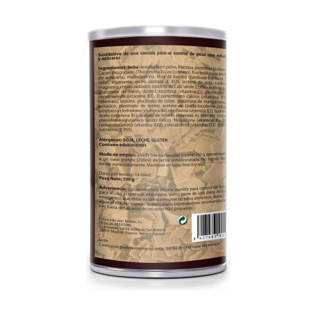 Batido sustitutivo de una comida, rico en proteínas, vitaminas y minerales. Ayuda al control de peso como parte de una dieta baja en calorías. Sabor chocolate.