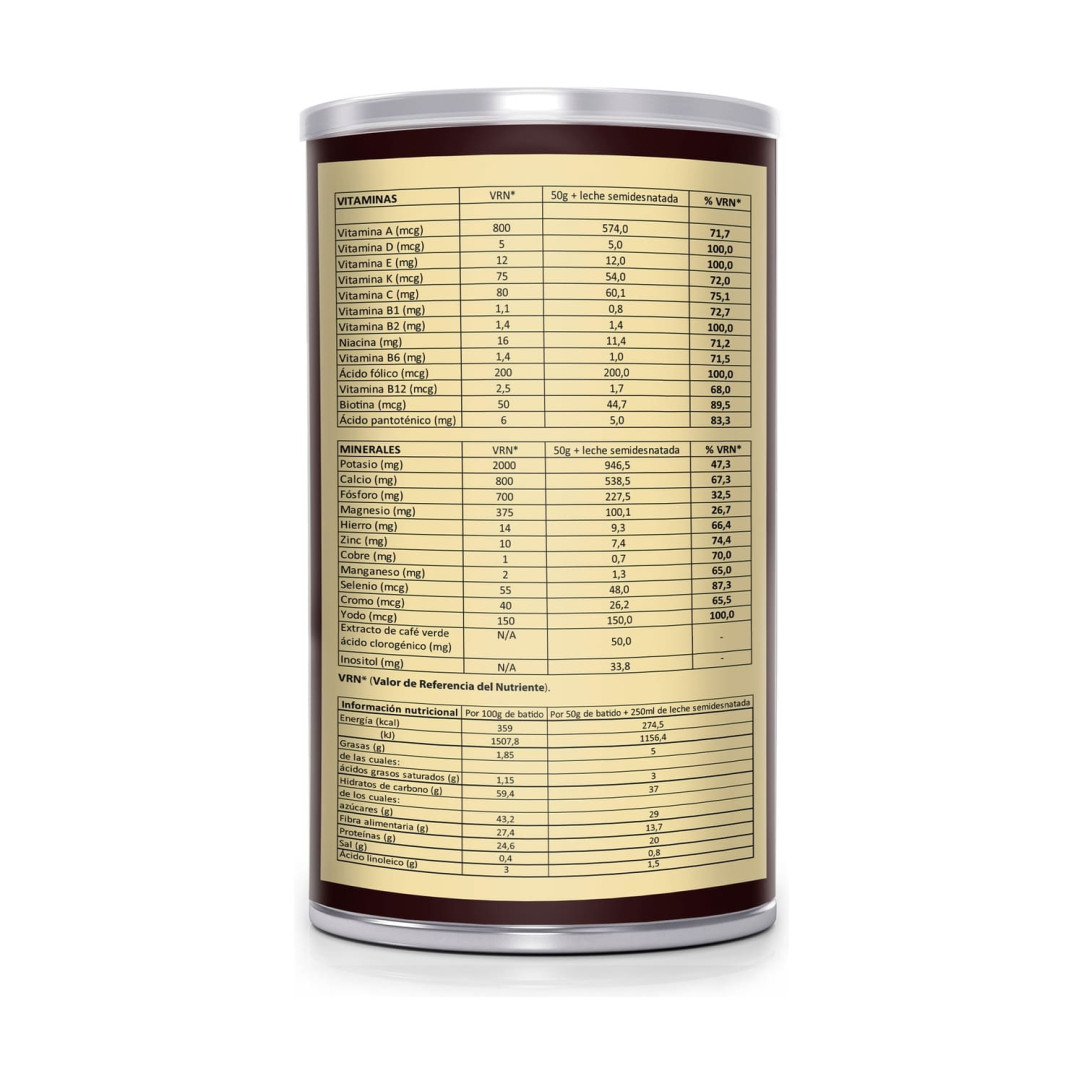 Fructosa, Mezcla de Proteínas ( Leche ), Fructo-Oligosacáridos, Maltodextrina, Café, Fibra de Bambú, Espesantes, Goma Xantana (E415), Carbonato de Magnesio, Citrato de Potasio, Café Verde, Gluconato de Hierro, Ácido L-Ascórbico ( Vitamina C ), Gluconato de Zinc, Nicotinamida ( Vitamina B3 ), D-Pantotenato Cálcico ( Vitamina B5 ), Colina Bitartrato, Inositol, Gluconato de Cobre, Gluconato de Manganeso, Yoduro de Potasio, Picolinato de Cromo, Acetato D-Alfa Tocoferol ( Vitamina E ), Hidrocloruro de Piridoxina ( Vitamina B6 ), Riboflavina ( Vitamina B2 ), Clorhidrato de Tiamina ( Vitamina B1 ), Acetato de Retinilo ( Vitamina A ), Selenito de Sodio, Acido Pteroilglutamico ( Ácido Fólico ), Filoquinona ( Vitamina K ), D-Biotina, Cianocobalamina ( Vitamina B12 ), Colecalciferol ( Vitamina D3 ), Edulcorantes, Sucralosa (E955), Aroma Natural de Capuchino.