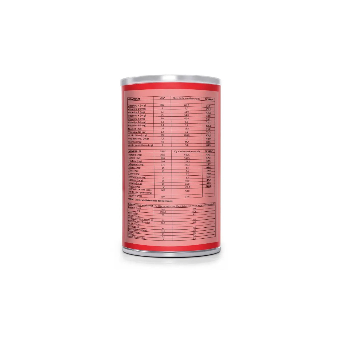 Vitamina B5, vitamina E, vitamina D3, fructooligosacáridos, vitamina B3, inositol, proteínas lácteas, vitamina A, yoduro potásico, vitamina B12, colina bitartrato, extracto de café verde, fresa liofilizada, fibra de bambú, D-biotina, ácido fólico, selenito sódico, vitamina K, gluconato de zinc, gluconato de manganeso, gluconato de cobre, goma xantana, carbonato de magnesio, picolinato de cromo, gluconato de hierro, fructosa, maltodextrina, sucralosa, citrato potásico, leche desnatada en polvo, vitamina C, vitamina B1, vitamina B2, vitamina B6.