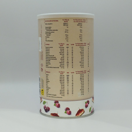 Leche desnatada en polvo, aislado de proteínas lácteas (leche), fructosa, espesante: goma xantana, acidulante: ácido cítrico, ácido linoleico conjugado, aromas naturales, colorante: rojo remolacha, hidróxido de magnesio, citrato potásico, sal, edulcorante: sucralosa; maltodextrina, ácido L-ascórbico (vitamina C), sulfato de hierro, acetato de D-alfa tocoferilo (vitamina E), gluconato de zinc, nicotinamida (vitamina B3), D-pantotenato cálcico (vitamina B5), acetato de retinilo (vitamina A), gluconato de cobre, gluconato de manganeso, piridoxina clorhidrato (vitamina B6), riboflavina (vitamina B2), tiamina clorhidrato (vitamina B1), colecalciferol (vitamina D3), ácido pteroilmonoglutámico (ácido fólico), yoduro potásico, picolinato de cromo, cianocobalamina (vitamina B12), filoquinona (vitamina K), selenito sódico y D-biotina.