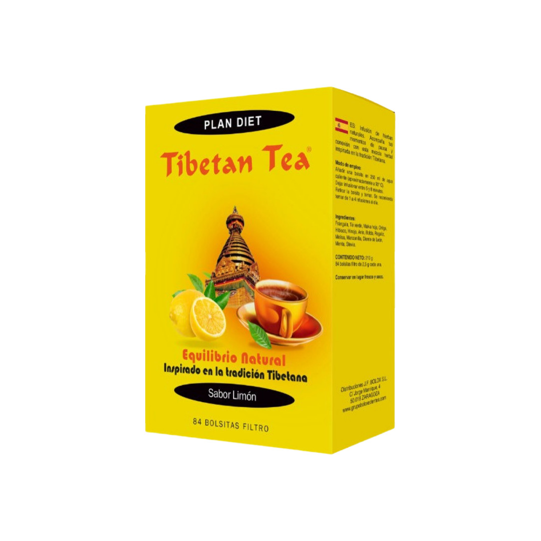 Tibetan Tea con Sabor a LimónCombinación de hierbas naturales, según una antigua fórmula tibetana. La sabiduría milenaria tibetana ha elaborado esta fórmula para el cuidado personal aportando regularidad a nuestro organismo y bienestar a nuestra calidad de vida.Modo de empleo: Vierta agua hirviendo en una taza y añada la bolsita de infusión, deje reposar 3-5 minutos. Se recomienda tomar 1 - 3 tazas diarias, aproximadamente 15 a 20 minutos después de cada comida.Ingredientes: Té verde, Escaramujo, Laurel, Tila, Menta Poleo, Hierba Luisa, AromatizanteNutrición per 100 gramosEnergía (cal.) 2.9Sodio (g.) 0Proteínas (g.) 0.13Carbohidratos (g.) 0.65Grasas (g.) 0.05Colesterol (mg) 0Presentación: Envase de 90 bolsitas de 2 gramos cada bolsita. Se preparan de 1 a 3 al día.