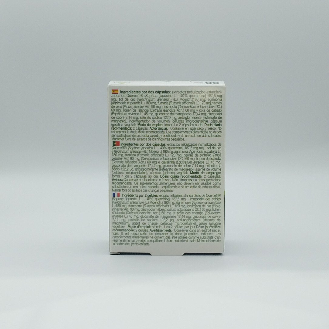 Por 2 cápsulas: extractos nebulizados estandarizados de acacia de Japón 510 mg (aporta 484 mg quercetina), sol de oro 180 mg, agrimonia 180 mg, fumaria 120 mg, yemas de pino 90 mg, desmodio 90 mg, líquen de Islandia 60 mg, cola de caballo 45 mg, vitamina C 80 mg, vitamina E 12 mg, vitamina A 800 μg, manganeso 2 mg, cobre 1 mg y selenio 55 μg (100% VRN de vitaminas y minerales).