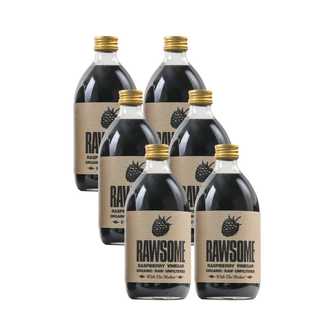 RawsomeVinagre de frambuesa ecológico sin filtrar con la "madre" natural. Perfecto para vinagretas, aliños y bebidas, combina sabor exquisito con beneficios antioxidantes de las frambuesas.