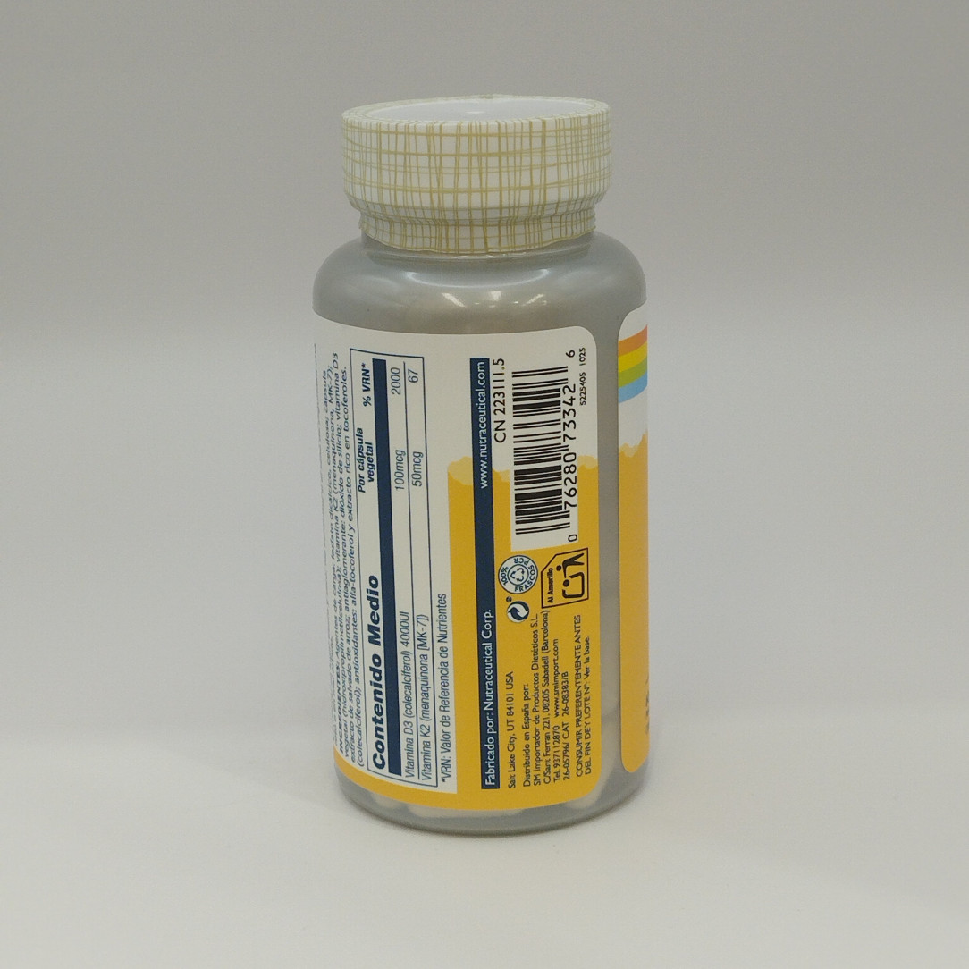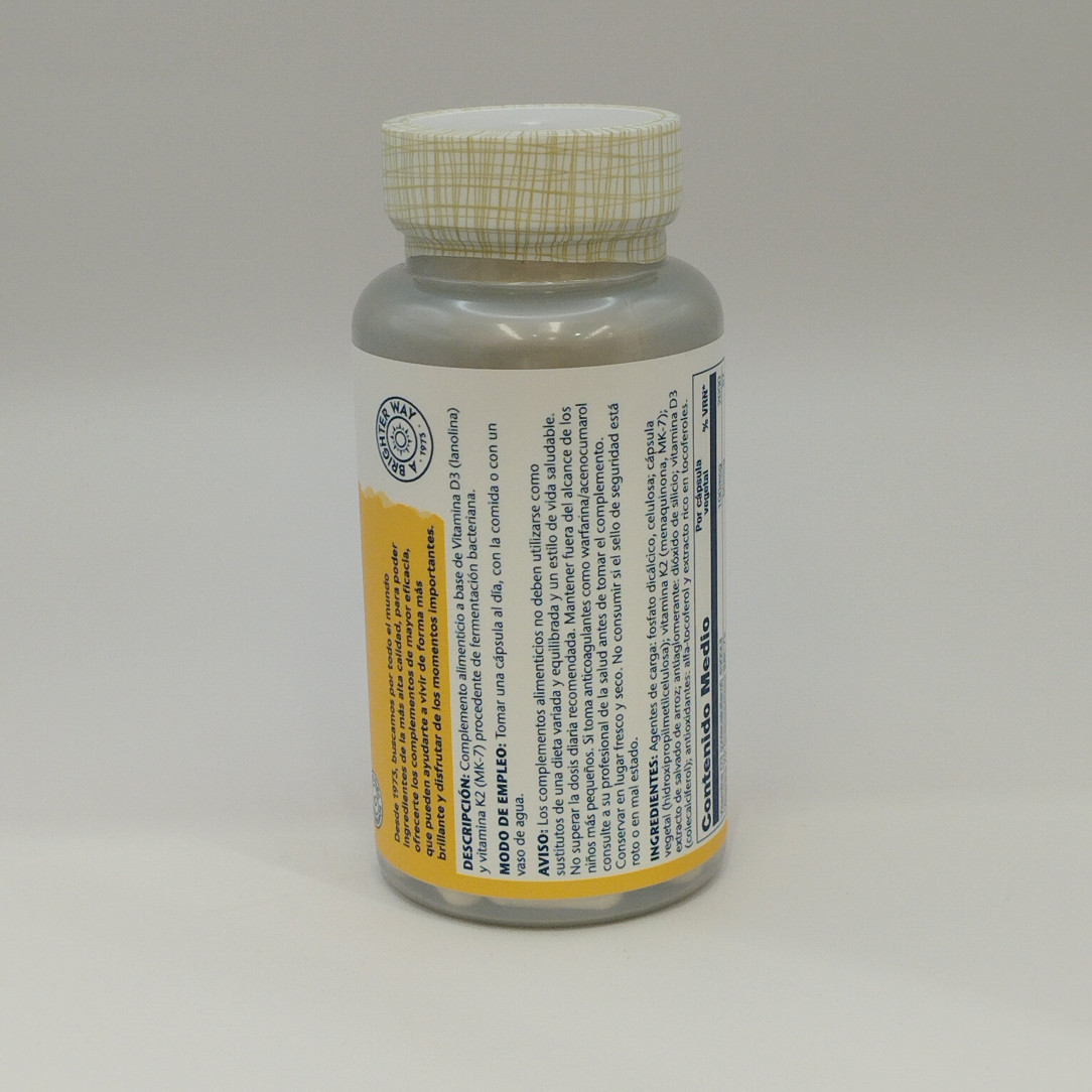SolarayComplemento con vitamina D3 natural (4.000 UI) y K2 de garbanzo que contribuye al mantenimiento de huesos normales y apoya el sistema inmunológico. Sin gluten, apto para vegetarianos.