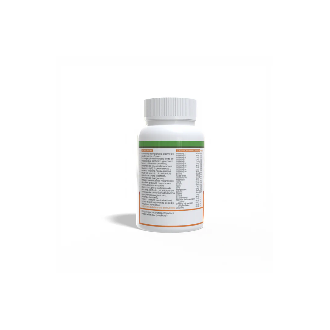 Vitamin Complex de Sotya es un completo multinutriente que combina vitaminas, minerales y extractos naturales como el ginseng, la coenzima Q10, la luteína y el licopeno. Esta fórmula ha sido diseñada para proporcionar un aporte energético diario, mejorar la resistencia al cansancio y favorecer funciones clave como la visión, la salud cardiovascular y el metabolismo energético.