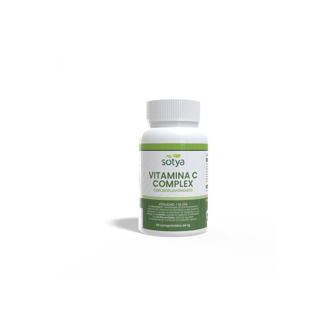 El suplemento Vitamina C Complex de Sotya combina vitamina C con bioflavonoides cítricos y acerola para ofrecer una acción antioxidante completa y apoyar el sistema inmunológico y nervioso. Su fórmula está diseñada para combatir el cansancio, proteger frente al estrés oxidativo y mejorar la circulación venosa.