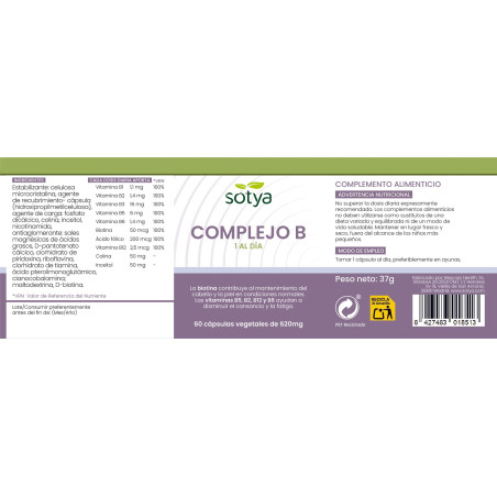 60 cápsulas de 600mg, con levadura de cerveza (370mg), colina (50mg), inositol (50mg), vitamina B3 (18mg), vitamina B5 (6mg), vitamina B6 (2mg), vitamina B2 (1.6mg), vitamina B1 (1.4mg), vitamina B9 (0.2mg), vitamina B12 (0.001mg), biotina (0.00015mg) Cápsula vegetal de celulosa. Una cápsula aporta el 100% de la CDR de todas las vitaminas del complejo B.Propiedades:
